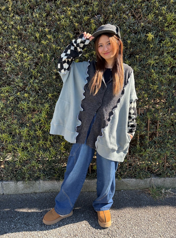 柔らかなニットとスウェット生地を組み合わせ、古着と新品のアイテムをドッキングしました。女性でも男性でも、性別問わず着用できるサイズ感で、どなたでも楽しんでいただけます。